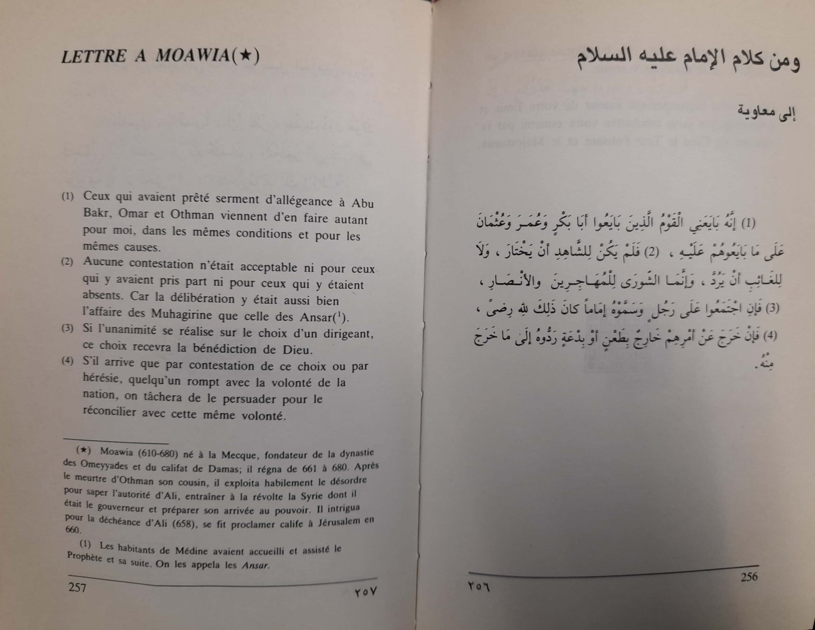 a fortiori que telle ne semblait pas être l’opinion tardive de l’imam ‘Ali, premier des imams chiites, selon les termes de la première lettre à Mou’awiyya qui lui est attribuée, et qui figure dans le recueil célèbre
