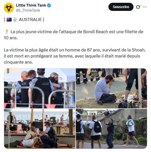 Une attaque terroriste a frappé dimanche la plage de Bondi Beach à Sydney, faisant 16 morts et de nombreux blessés. Selon les médias australiens, deux assaillants ont visé des personnes de confession juive réunies pour célébrer Hanouka. En France, des instances musulmanes ont condamné unanimement, « avec fermeté », un acte « de barbarie ».