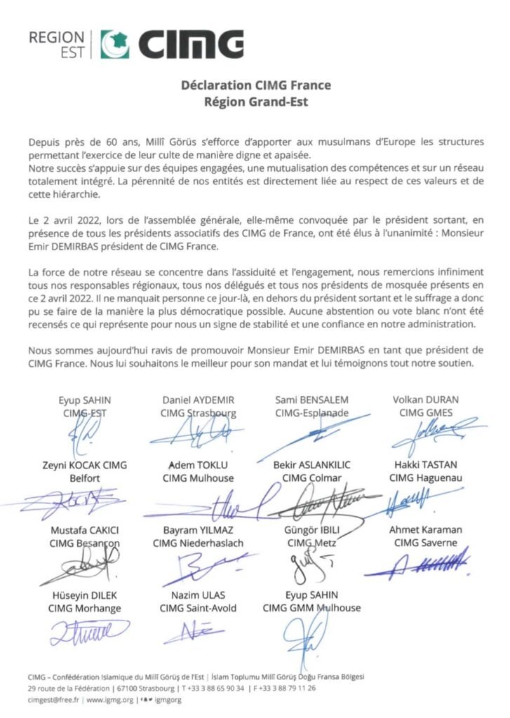 « Le 2 avril 2022, lors de l’assemblée générale, elle-même convoquée par le président sortant, en présence de tous les présidents associatifs des CIMG France, ont été élus à l’unanimité : Monsieur Emir Demirbas, président de CIMG France (…) Nous lui témoignons tout notre soutien (…) Il ne manquait personne ce jour-là, en dehors du président sortant et le suffrage a donc pu se faire de la manière la plus démocratique possible. Aucune abstention ou vote blanc n’ont été recensés ce qui représente pour nous un signe de stabilité et une confiance en notre administration. »