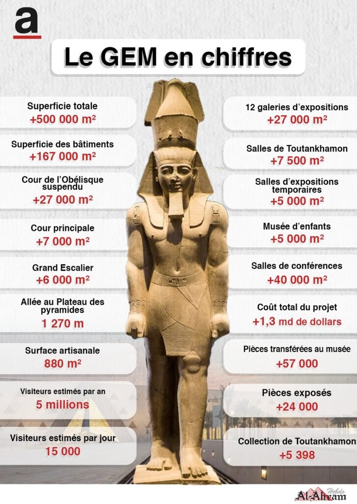 La logistique a nécessité de repenser les transports au Caire, mégapole de 23 millions d’habitants. Les routes menant au GEM ont été rénovées et un nouvel aéroport a été construit. Le Grand Musée Égyptien, le plus vaste musée archéologique consacré à la civilisation égyptienne antique, s’étend sur un demi-million de mètres carrés et abrite plus de 100 000 objets, dont la collection complète de Toutânkhamon.