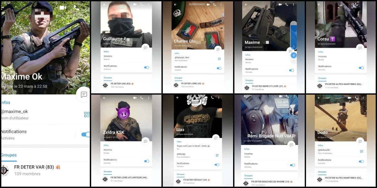 Le groupuscule néo-nazi « # FR DETER », co-fondé par un certain Vlad est un groupe créé pour réunir des identitaires de toute la France. Révélée par la plateforme maghrébine Tajmaât, l’existence de ce groupe est désormais connue du grand public. Très actif sur Telegram, le groupe réunissait toutes sortes de profils (lycéens, universitaires, père de famille, fonctionnaires, individus se réclamant de la police, de la BAC, des CRS ou des militaires, militants politiques) réunis par leur haine des arabes, des noirs et des musulmans, qu’ils qualifient d’ennemis numéro 1.