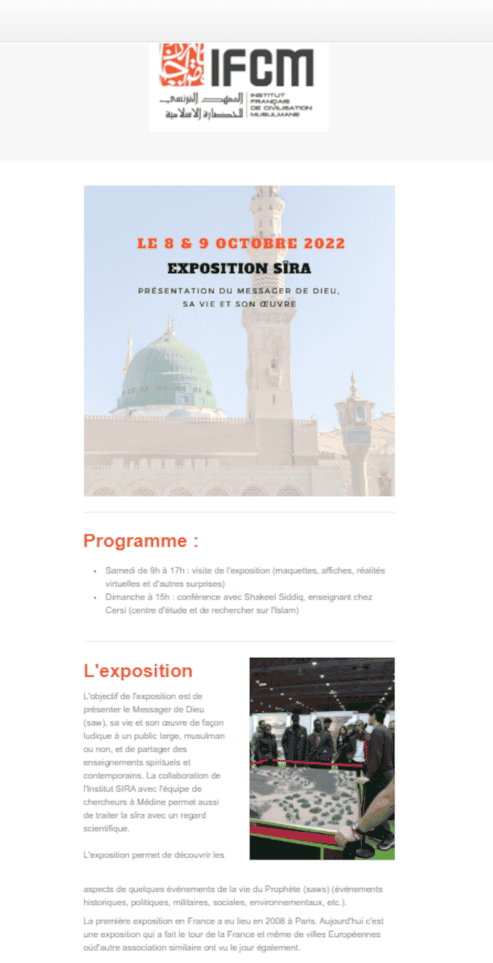 Du côté des membres de l’Institut Sira et de sa direction, joints par Mizane.info, on a une autre version des évènements. Tout commence il y a un an. L’institut Sira est invité à présenter son exposition sur le Prophète à la mosquée du Cher. Selon les organisateurs, l’évènement a été un succès. Il se trouve que l’un des membres de l’assistance est le responsable événementiel au sein de l’IFCM, Hafid Sekhri. « Il nous a demandé avec insistance de présenter l’exposition à l’IFCM », confie l’un des membres de l’équipe de l’Institut Sira à la rédaction de Mizane.info. Les organisateurs réclament une demande officielle par courrier électronique. Ce qui est fait. Les détails financiers et organisationnels de l’exposition sont abordés. Un document de l’IFCM sur les droits-photos est même adressé à l’Institut Sira. Le service communication de l’IFCM prend ensuite la relève et adresse un message aux organisateurs le 27 juillet. « La chargée de communication de l’IFCM nous a demandé de lui adresser des éléments photos et historiques de l’exposition pour assurer la communication d’un évènement que l’IFCM s’annonce « très fier » de recevoir, selon les termes employés. » Dimanche dernier, un rendez-vous est pris pour monter l’exposition dans les locaux. L’IFCM communique officiellement pour annoncer l’évènement. Tout semble aller pour le mieux pour les 8 et 9 octobre, date prévue de l’exposition. Jusqu’à ce mardi 4 octobre où l’un des proches de la direction de l’Institut Sira leur apprend que l’évènement est annulé et que l’annonce de cette annulation a été faite sur les réseaux sociaux. « On a eu du mal à y croire car tout le matériel était entreposé là-bas et que nous n’avions pas été prévenus. Jusqu’à présent, nous n’avons reçu aucune réponse officielle. »