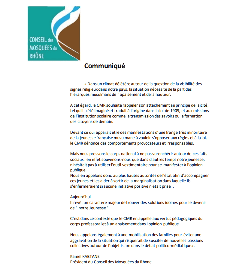 « Le Conseil des mosquées du Rhône, dit-il, a toujours pris ses responsabilités quand il le fallait, alors que beaucoup d’autres restaient silencieux. Nous l’avons montré récemment dans l’affaire Iquioussen où nous avons pris position et pris des coups. Nous ne sommes pas des supplétifs du gouvernement », précise le président du Conseil des Mosquées du Rhône. Il s’agit seulement, réitère-t-il, de dénoncer « l’utilisation identitaire de vidéos faites dans un contexte dominé par le sentiment de rejet en France ». « Nous ne sommes pas non plus contre les jeunes, ou contre le voile. Nous l’avons souligné, c’est un phénomène qui à chaque époque touche toutes sortes de jeunes. »