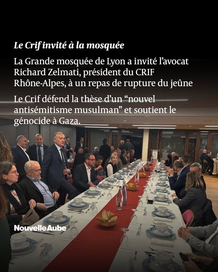 Le 10 mars, la Grande mosquée de Lyon a organisé un iftar réunissant plusieurs personnalités venues partager le repas de la rupture du jeûne. Parmi les invités figuraient la préfète du Rhône, Fabienne Buccio, ainsi que le président du CRIF, Richard Zelmati. La présence de ce dernier, soutien assumé du génocide israélien, a provoqué une vague d’indignation au sein de la communauté musulmane. Beaucoup y ont vu une forme de déni des massacres en cours à Gaza.