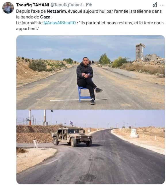 « Les forces israéliennes ont retiré leurs blindés et démantelé leurs positions militaires dans le corridor de Netzarim, sur la route de Salaheddine, permettant désormais une libre circulation des véhicules. »