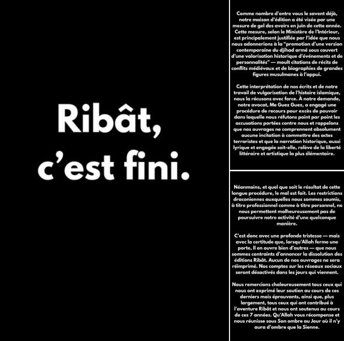 « Les restrictions draconiennes auxquelles nous sommes soumis, à titre professionnel comme à titre personnel, ne nous permettent malheureusement pas de poursuivre notre activité d’une quelconque manière. C’est donc avec une profonde tristesse — mais avec la certitude que, lorsqu’Allah ferme une porte, Il en ouvre bien d’autres — que nous sommes contraints d’annoncer la dissolution des éditions Ribât. Aucun de nos ouvrages ne sera réimprimé. Nos comptes sur les réseaux sociaux seront désactivés dans les jours qui viennent. »