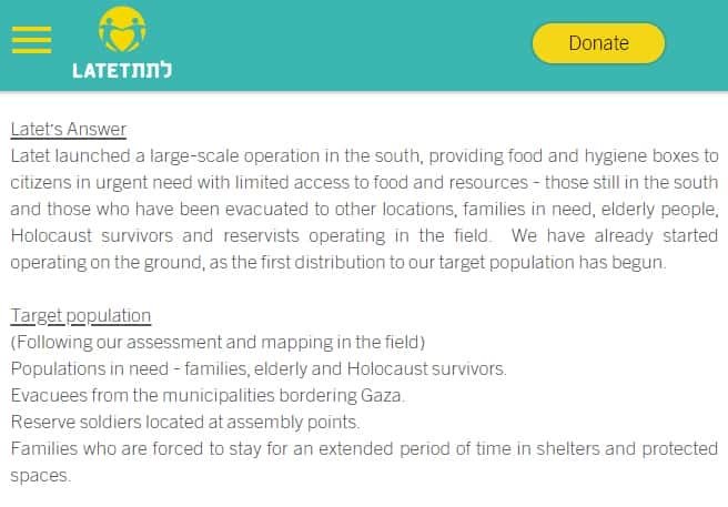 Latet est une organisation fondée en 1996 par Gilles Darmon ancien président de l’UEJF-Paris 1. L’association se présente comme une ONG luttant contre la faim en Israël et fournissant des colis alimentaires aux rescapés de l’holocauste. Depuis le 7 octobre, elle mène une série de campagnes d’aide aux israéliens déplacés ainsi qu’aux soldats israéliens sur zone.