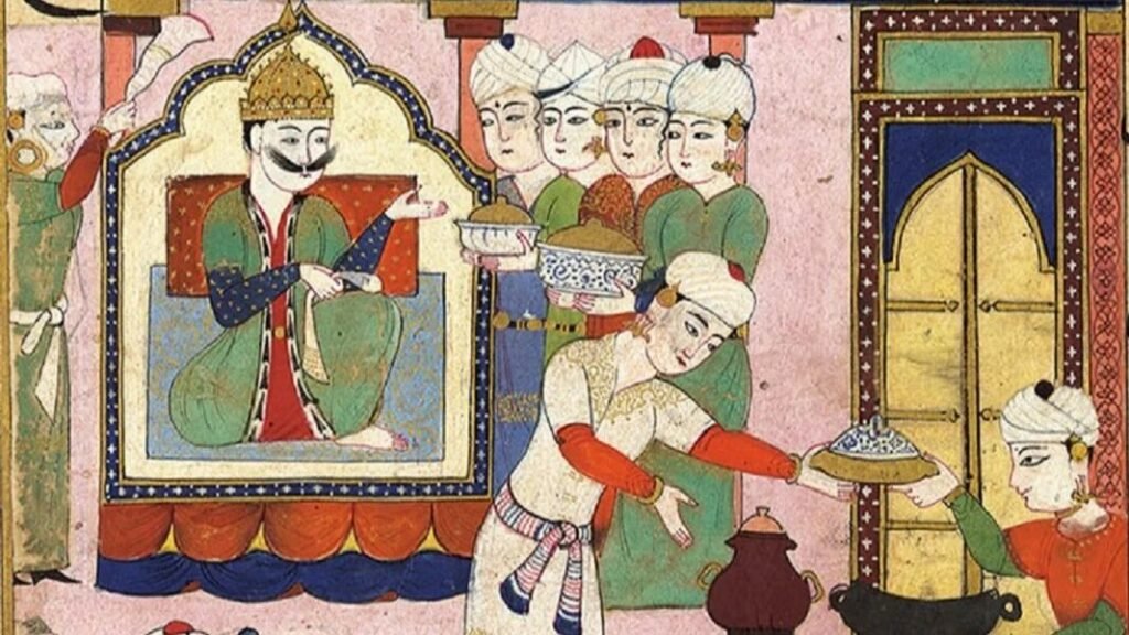 Les œuvres de cette exposition comprend de nombreuses scènes magnifiques de personnes se rassemblant pour manger, qu’il s’agisse d’un banquet organisé en Iran, d’un pique-nique idyllique à deux sous un arbre ou d’une scène de l’empereur Babur savourant un repas. Comme l’explique Katherine Kasdorf, ces peintures ont souvent été réalisées spécifiquement pour compléter la culture culinaire – un fait qui passe souvent inaperçu.