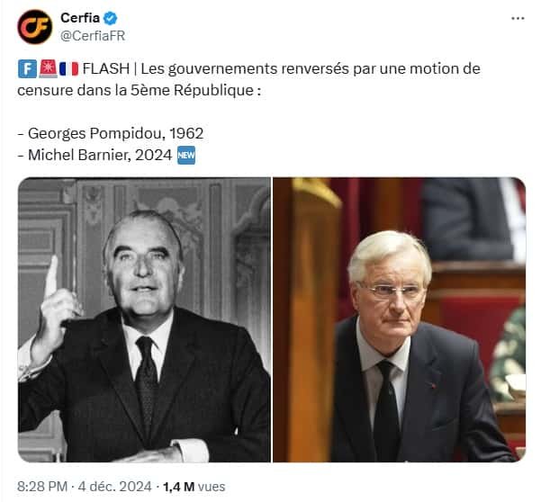 Le gouvernement de Michel Barnier est tombé. L’Assemblée nationale française a renversé le gouvernement mercredi à Paris, une première depuis 1962. Les députés de la gauche et du Rassemblement national ont conjointement adopté une motion de censure ouvrant une nouvelle période d’incertitude politique dans le pays. Focus.