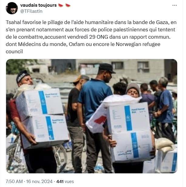 Ce lundi, l’UNRWA a déploré « le violent pillage » d’un important convoi de camions transportant de l’aide humanitaire vers Gaza durant le week-end. Plusieurs sources accusent l’armée israélienne de fermer les yeux sur les pilleurs armés et d’entraver volontairement la logistique des travailleurs humanitaires. En réponse à ces incidents, le Hamas a annoncé le lancement d’une campagne contre les pilleurs.