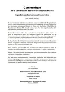 La CFM a eu la primeur publiant le 17 mai un communiqué exprimant « ses plus vives inquiétudes face à la dégradation de la situation au Proche-Orient. Le bilan des victimes civils à Gaza –majoritairement des femmes et des enfants – ne cesse de s’alourdir (…) et laisse une population meurtrie et traumatisés par ces bombardements continus. La Coordination des fédérations musulmanes appelle le gouvernement français et l’Union européenne à intervenir instamment afin que cesse ce cycle de violences inouï qui tue des civils innocents de chaque côté. »
