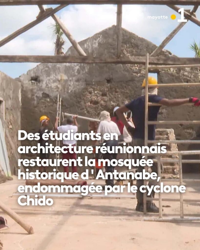 Des étudiants de l’école d’architecture de La Réunion ont participé à une immersion sur le site de la mosquée historique d’Antanabe, située à Poroani sur l’île de Mayotte. Aux côtés de l’agence Building for Climate, spécialisée dans la préservation du patrimoine, ils ont contribué à la restauration de l’édifice religieux, endommagé par le passage du cyclone Chido. Zoom.