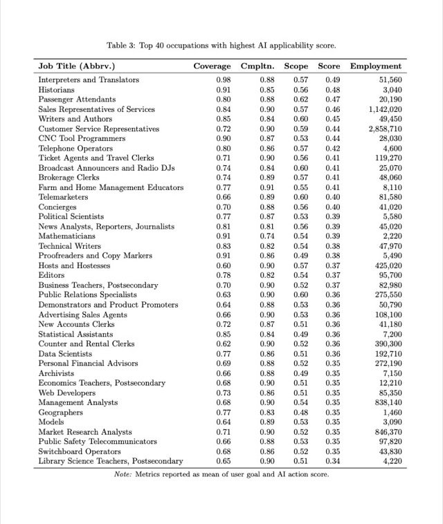 Les chercheurs ont ensuite établi un score d’applicabilité de l’IA, mesurant la proportion d’activités, dans chaque métier, qui sont aujourd’hui prises en charge par Copilot. Ce score combine trois critères : la fréquence à laquelle une tâche est confiée à l’IA, le taux de réussite de l’outil, et l’ampleur réelle de l’aide fournie. À la lumière de ces données, un constat s’impose : les métiers « centrés sur l’écrit, l’oral et la transmission d’informations » sont les plus exposés.