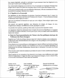 Pour clarifier l’esprit qui anime leur action et pour joindre le geste à l’esprit, les trois fédérations ont lu et signé un document réaffirmant leur attachement aux lois de la République, dont la rédaction de Mizane.info restitue l’intégralité.