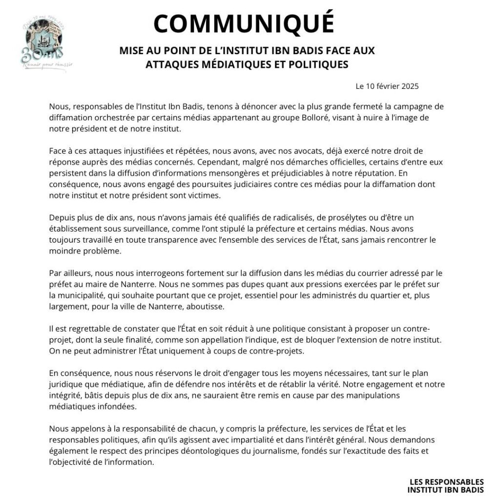 Indignés, les dirigeants de l’institut Ibn Badis dénoncent une campagne médiatique de dénigrement : « Une campagne de presse est orchestrée avec pour seul dessein, le dénigrement de l’institut Ibn Badis », écrivent-ils dans un communiqué.