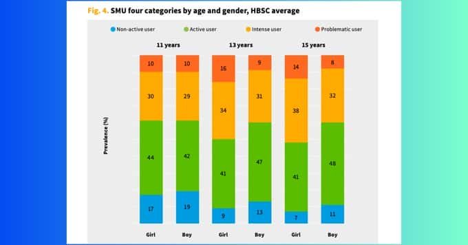 Les données ont été recueillies auprès de 280 000 jeunes âgés de 11, 13, et 15 ans de 44 pays d’Europe, d’Asie centrale et du Canada. Elles révèlent que pour l’année 2022, 11 % des adolescents (13 % des filles et 9 % des garçons) montraient des signes d’utilisation problématique des réseaux sociaux, contre 7 % quatre ans auparavant.
