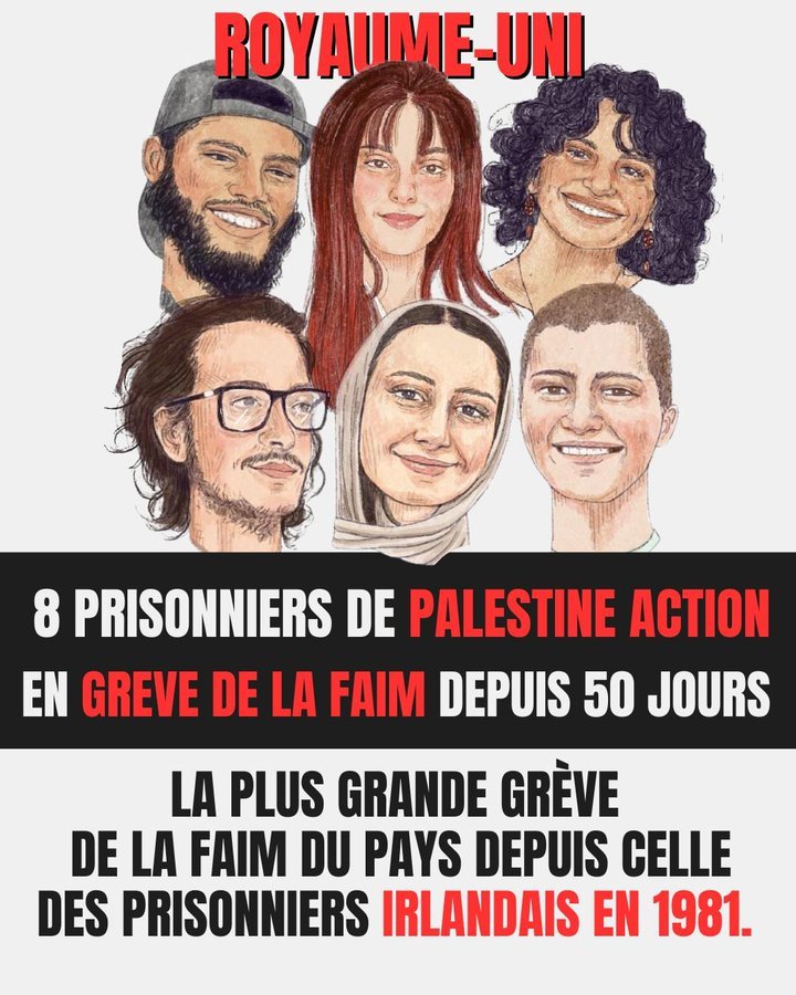 Les huit prisonniers concernés sont tous placés en détention provisoire, sans avoir été jugés. La majorité est impliquée dans l’affaire dite des « Filton 24 », accusés d’avoir participé à une action menée en août 2024 contre une usine d’Elbit Systems à Filton, où des dégâts estimés à plus d’un million de livres sterling auraient été causés.