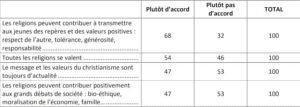 Elément positif, 68 % des Français pensent que les religions « peuvent contribuer à transmettre aux jeunes des repères et des valeurs positives ». Ils étaient cependant 77 % à le penser en 2009.