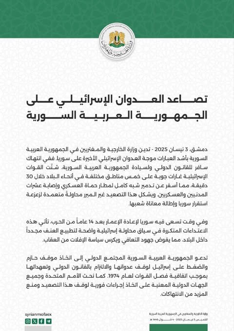 Hier, mercredi, des frappes israéliennes ont ciblé l’aéroport militaire de Hama, causant plusieurs pertes humaines. L’Observatoire syrien des droits de l’homme (OSDH) a rapporté des attaques israéliennes dans plusieurs régions de la Syrie, notamment à Damas et à Hama. L’armée israélienne a également mené une incursion aux abords de la ville de Nawa, située à l’ouest du gouvernorat de Deraa, dans le sud du pays.