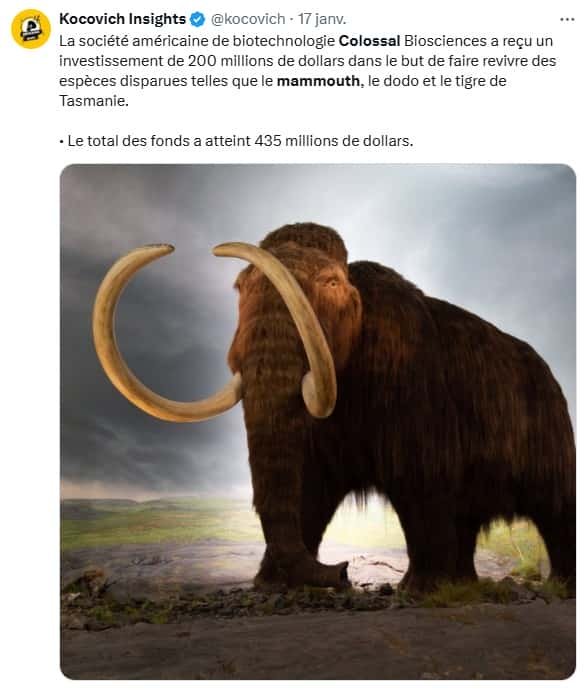 Grâce aux avancées en génie génétique, une startup américaine Colossal Biosciences prévoit de ressusciter des espèces disparues, comme le mammouth laineux, le dodo et le tigre de Tasmanie, d’ici 2028. L’entreprise vient de lever 200 millions de dollars pour financer son projet. Explications.